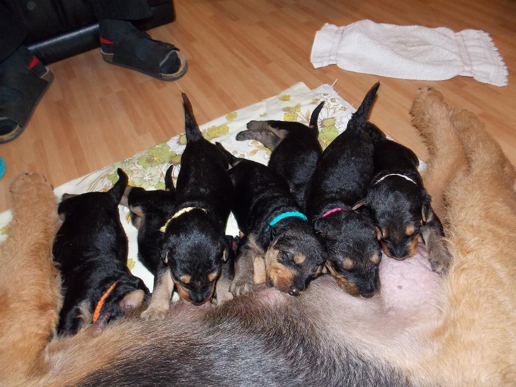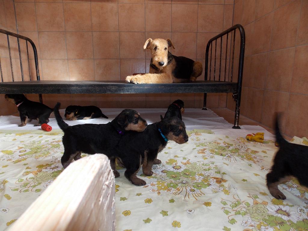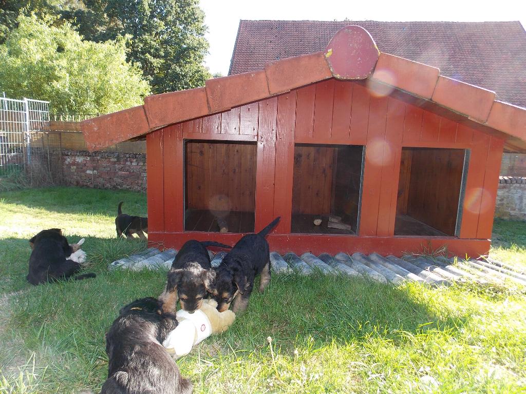 Die Welpen werden im Welpenzimmer geboren, welches an unser Schlafzimmer angrenzt. Wir sind immer bei der Geburt unserer Welpen dabei um, wenn es nötig ist, unsere Hündinnen zu unterstützen. Unsere Airedale Babys werden sehr früh mit vielen Eindrücken des späteren Lebens vertraut gemacht. Sie werden vom ersten Tag an mehrmals täglich liebevoll in die Hände genommen und dabei wird gleichzeitig ihre Entwicklung kontrolliert. Ab der fünften Lebenswoche kommen die Welpen in den Welpenzwinger. Hier erledigen sie prompt ihre großen und kleinen Geschäfte im großen Freiauslauf. Nun lernen sie auch den Rest ihres Hunderudels kennen und die sozialen Kontakte erweitern wir von der Familie auf fremde Menschen und Kinder. Mit sechs Wochen kommen sie wieder stundenweise in kleinen Gruppen in die Wohnung um Geräusche von Staubsauger, Küchenmaschinen u.s.w. kennen zu lernen und die erste Erziehung zu genießen. Die ersten Ausflüge mit dem Auto und anschließenden kleinen Spaziergängen in fremder Umgebung mit Mutter und uns sind wichtig und prägend. In unserem großen Naturgarten können unsere Welpen unter Aufsicht nach Herzenslust buddeln, streiten und spielen.