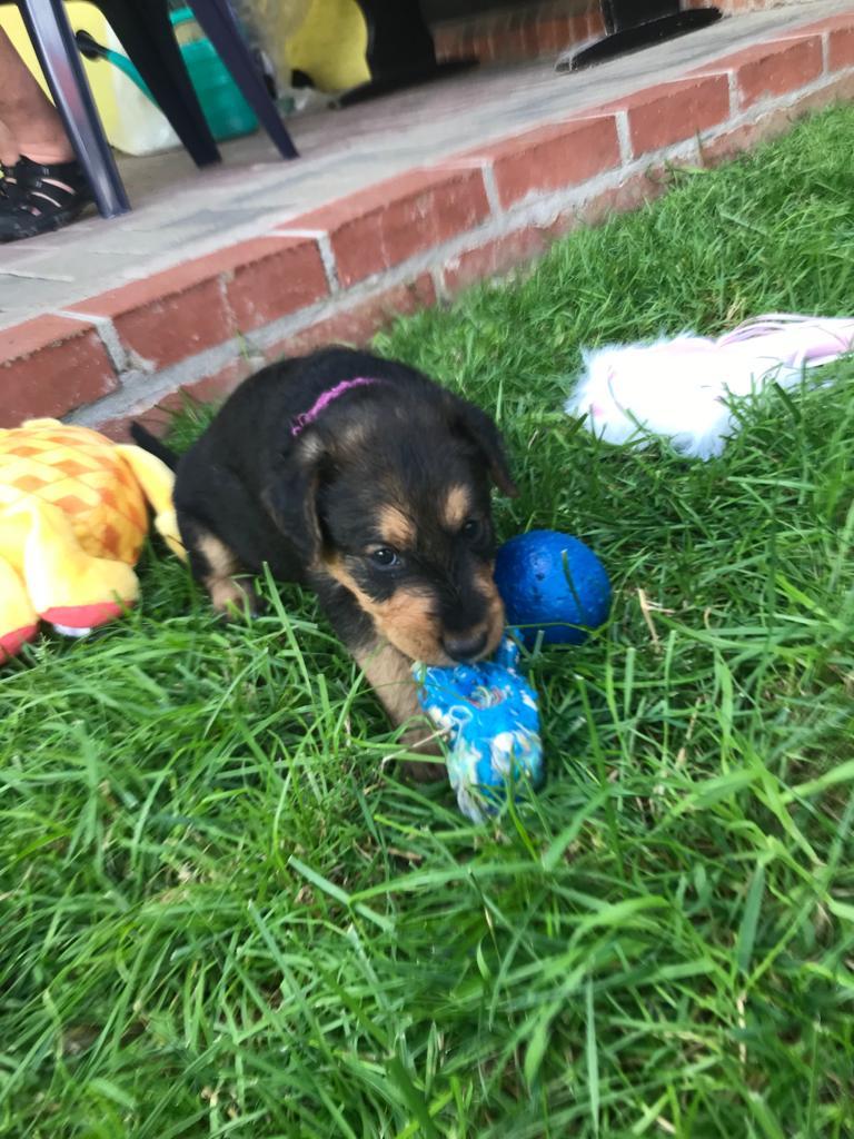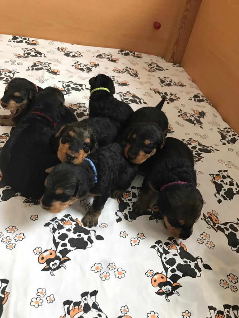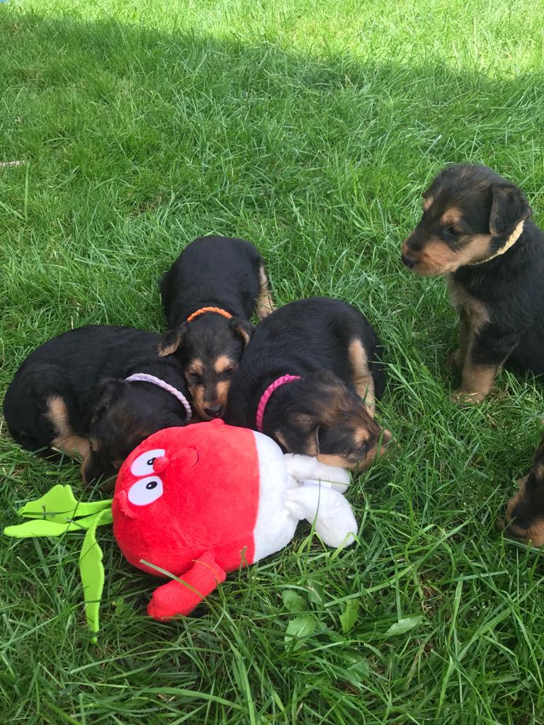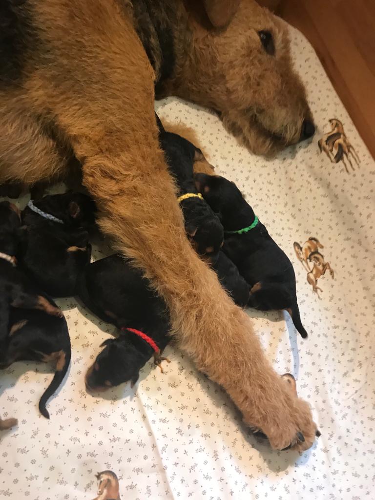Die Welpen werden im Welpenzimmer geboren, welches an unser Schlafzimmer angrenzt. Wir sind immer bei der Geburt unserer Welpen dabei um, wenn es nötig ist, unsere Hündinnen zu unterstützen. Unsere Airedale Babys werden sehr früh mit vielen Eindrücken des späteren Lebens vertraut gemacht. Sie werden vom ersten Tag an mehrmals täglich liebevoll in die Hände genommen und dabei wird gleichzeitig ihre Entwicklung kontrolliert. Ab der fünften Lebenswoche kommen die Welpen in den Welpenzwinger. Hier erledigen sie prompt ihre großen und kleinen Geschäfte im großen Freiauslauf. Nun lernen sie auch den Rest ihres Hunderudels kennen und die sozialen Kontakte erweitern wir von der Familie auf fremde Menschen und Kinder. Mit sechs Wochen kommen sie wieder stundenweise in kleinen Gruppen in die Wohnung um Geräusche von Staubsauger, Küchenmaschinen u.s.w. kennen zu lernen und die erste Erziehung zu genießen. Die ersten Ausflüge mit dem Auto und anschließenden kleinen Spaziergängen in fremder Umgebung mit Mutter und uns sind wichtig und prägend. In unserem großen Naturgarten können unsere Welpen unter Aufsicht nach Herzenslust buddeln, streiten und spielen.
