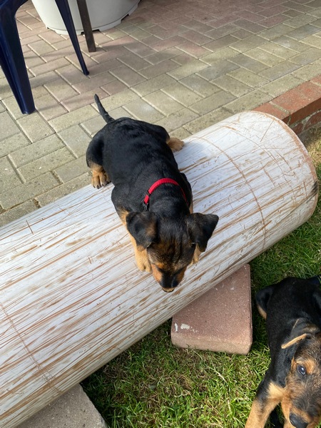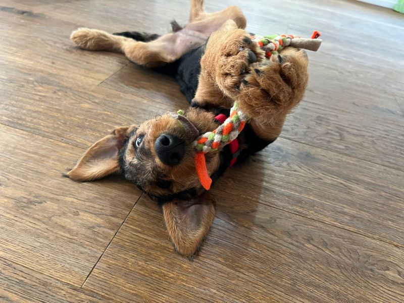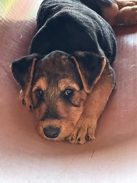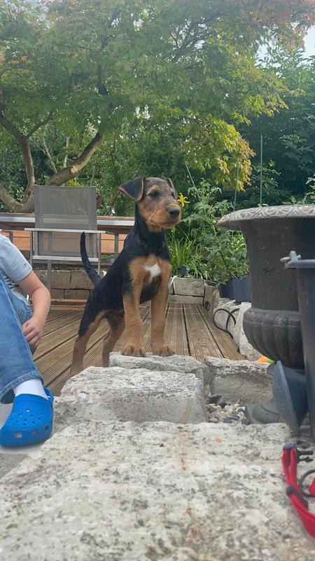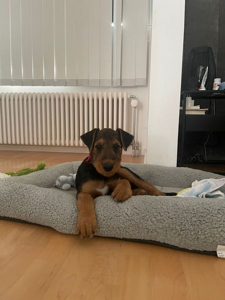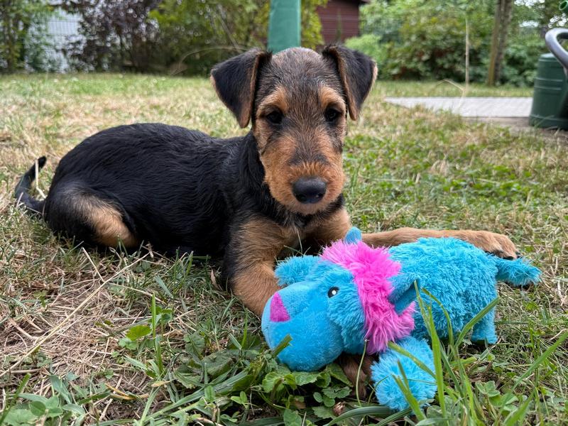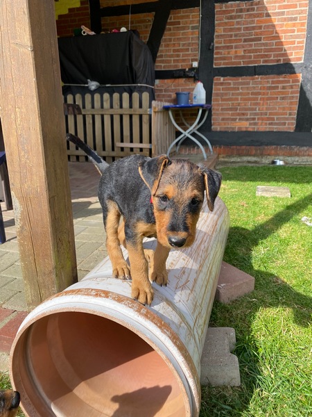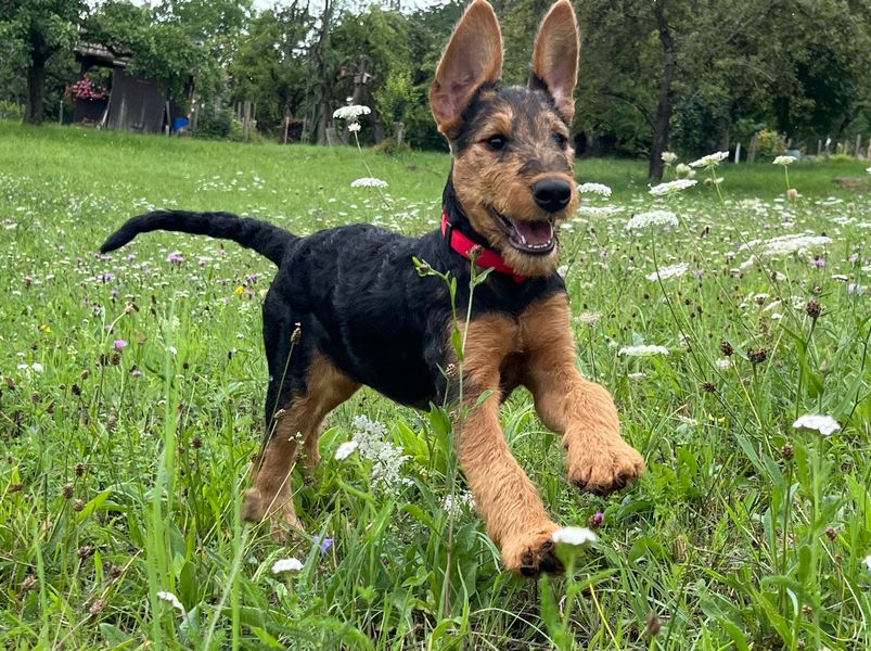 Die Welpen werden im Welpenzimmer geboren, welches an unser Schlafzimmer angrenzt. Wir sind immer bei der Geburt unserer Welpen dabei um, wenn es nötig ist, unsere Hündinnen zu unterstützen. Unsere Airedale Babys werden sehr früh mit vielen Eindrücken des späteren Lebens vertraut gemacht. Sie werden vom ersten Tag an mehrmals täglich liebevoll in die Hände genommen und dabei wird gleichzeitig ihre Entwicklung kontrolliert. Ab der fünften Lebenswoche kommen die Welpen in den Welpenzwinger. Hier erledigen sie prompt ihre großen und kleinen Geschäfte im großen Freiauslauf. Nun lernen sie auch den Rest ihres Hunderudels kennen und die sozialen Kontakte erweitern wir von der Familie auf fremde Menschen und Kinder. Mit sechs Wochen kommen sie wieder stundenweise in kleinen Gruppen in die Wohnung um Geräusche von Staubsauger, Küchenmaschinen u.s.w. kennen zu lernen und die erste Erziehung zu genießen. Die ersten Ausflüge mit dem Auto und anschließenden kleinen Spaziergängen in fremder Umgebung mit Mutter und uns sind wichtig und prägend. In unserem großen Naturgarten können unsere Welpen unter Aufsicht nach Herzenslust buddeln, streiten und spielen.
